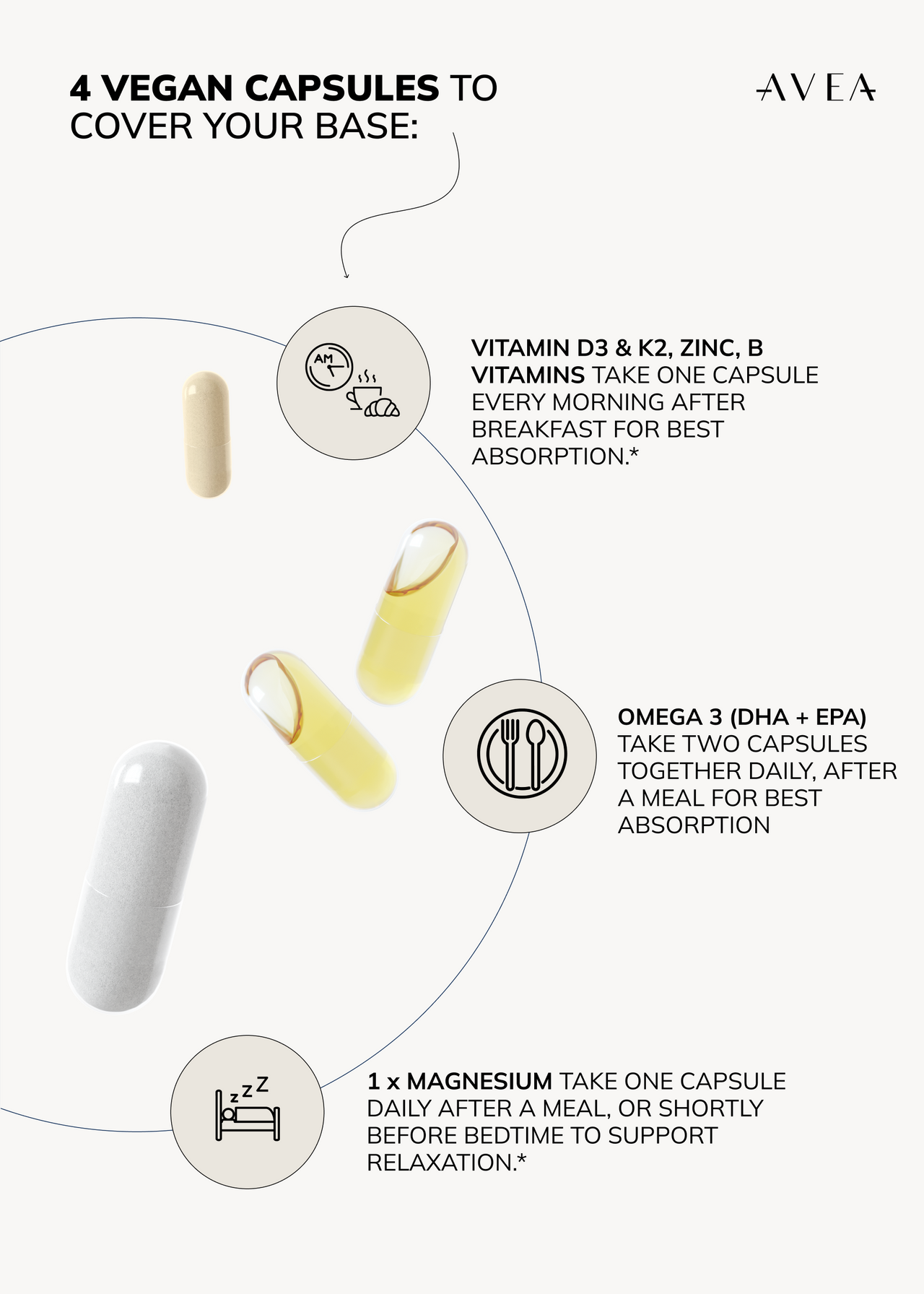 ✔ Visiškai veganiški ir lengvai įsisavinami D3, K2, metilintas B kompleksas, cinko pikolinatas, magnio bisglicinatas ir dumblių Omega-3.
