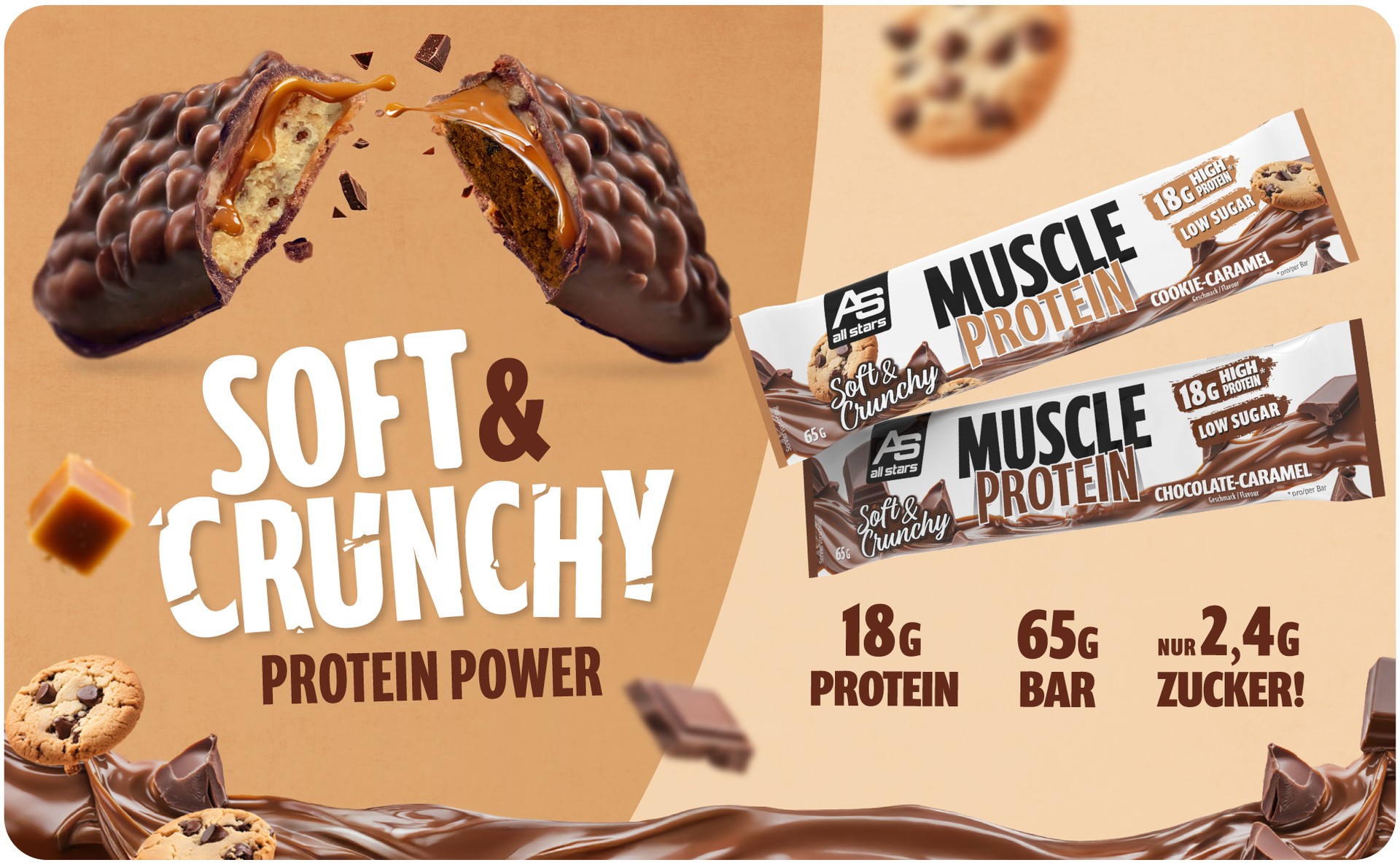 Naujasis ALL STARS baltymų batonėlis yra minkštas ir traškus. Kiekvienoje porcijoje (65 g) yra mažai cukraus, bet 18 g baltymų, t. y. beveik 30 %. Baltymų mišinys pagamintas iš aukštos kokybės pieno baltymų ir išrūgų baltymų koncentrato. Traškumo efektas pasiekiamas gardžiais traškiais gabalėliais, o batonėliai padengti subtiliu pieninio šokolado glaistu. Batonėliui naudojami kokosų riebalai, o ne palmių riebalai, ir prie natūralių komponentų nededama jokio papildomo cukraus. Idealiai tinka visiems sveikata besirūpinantiems žinovams kaip papildomas baltymų šaltinis raumenų auginimo etapuose, raumenų palaikymui arba tiesiog kaip baltymų turtingas saldus pakaitalas.
